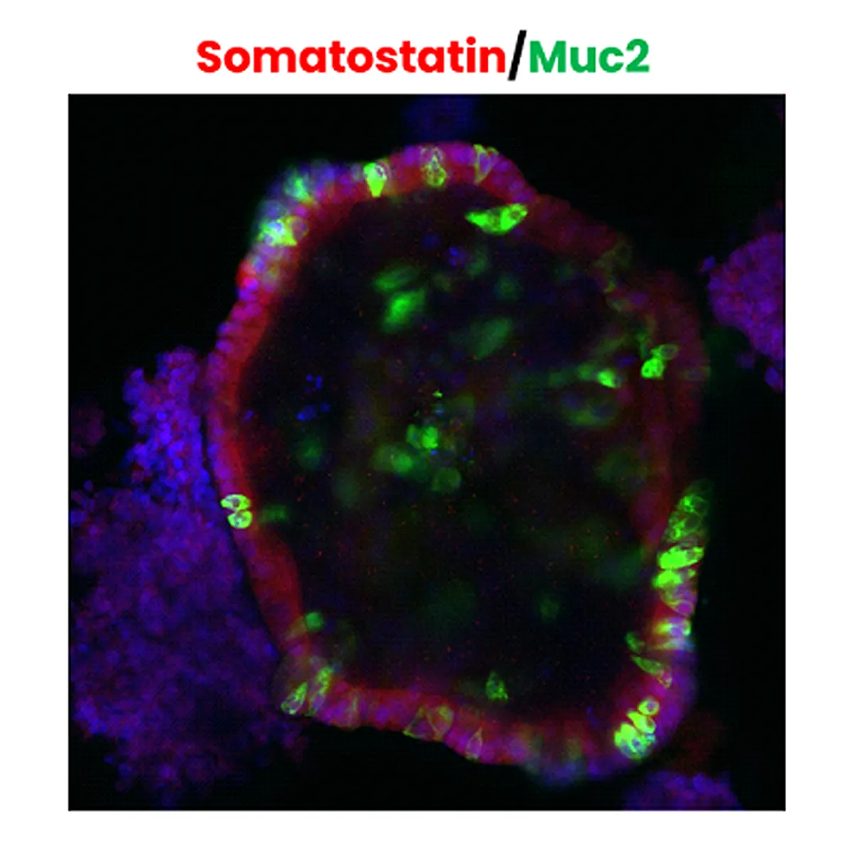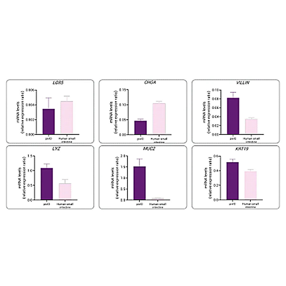 - Contain functional enterocytes, goblet, Paneth, enteroendocrine, and stem cells expressing LGR5, VILLIN, MUC2, CHGA, and CYP3A4
