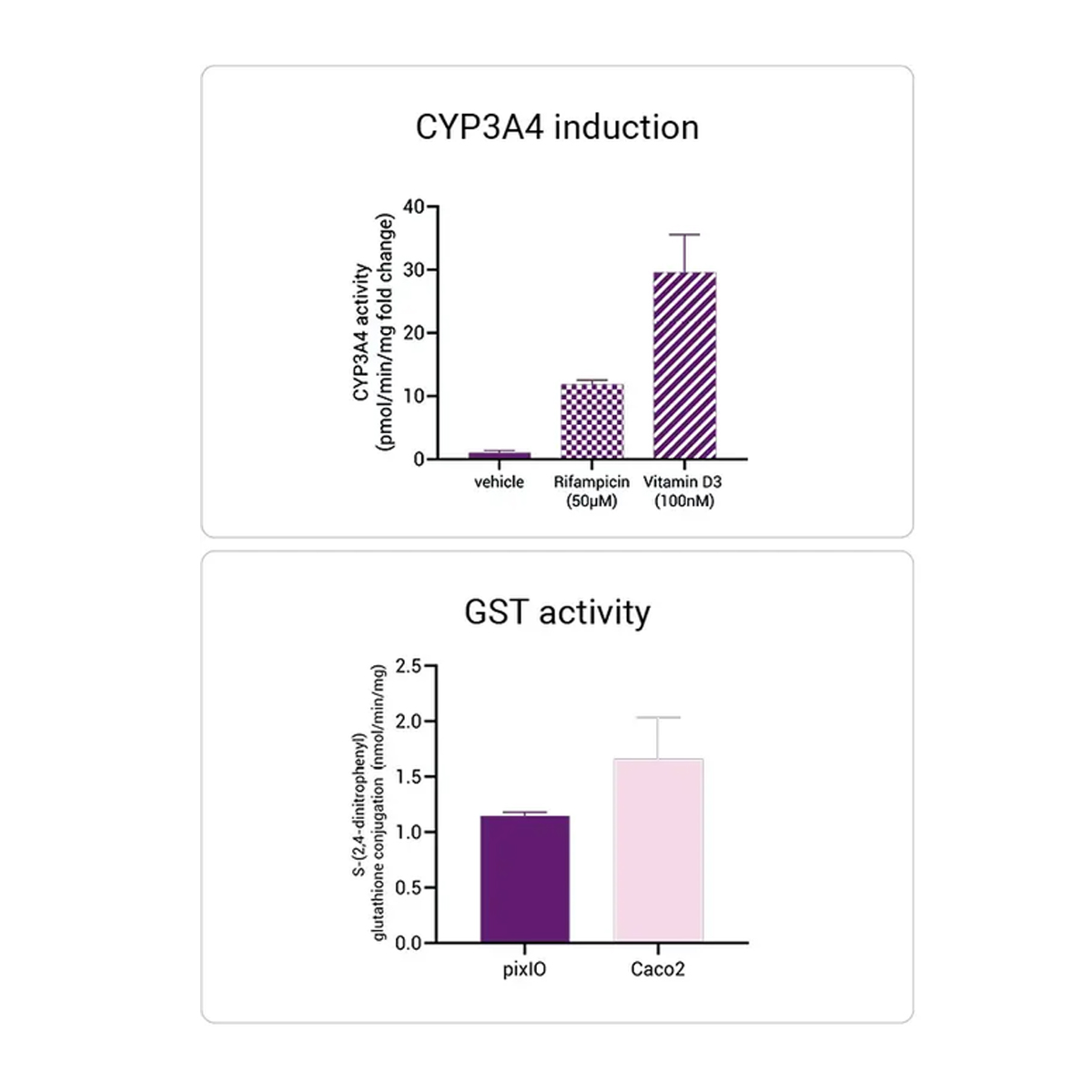 They contain the full repertoire of intestinal cell types: enterocytes, goblet cells, Paneth cells, enteroendocrine cells, and stem cells, arranged in a crypt–villus architecture.These models recapitulate nutrient transport, barrier integrity, and drug metabolism pathways, providing a reproducible and scalable alternative to primary intestinal tissue. With robust expression of ADME transporters, CYP450 enzymes, and detoxification pathways, pixIO are ideally suited for studies in drug absorption, efflux transport, safety assessment, and infectious disease modeling.